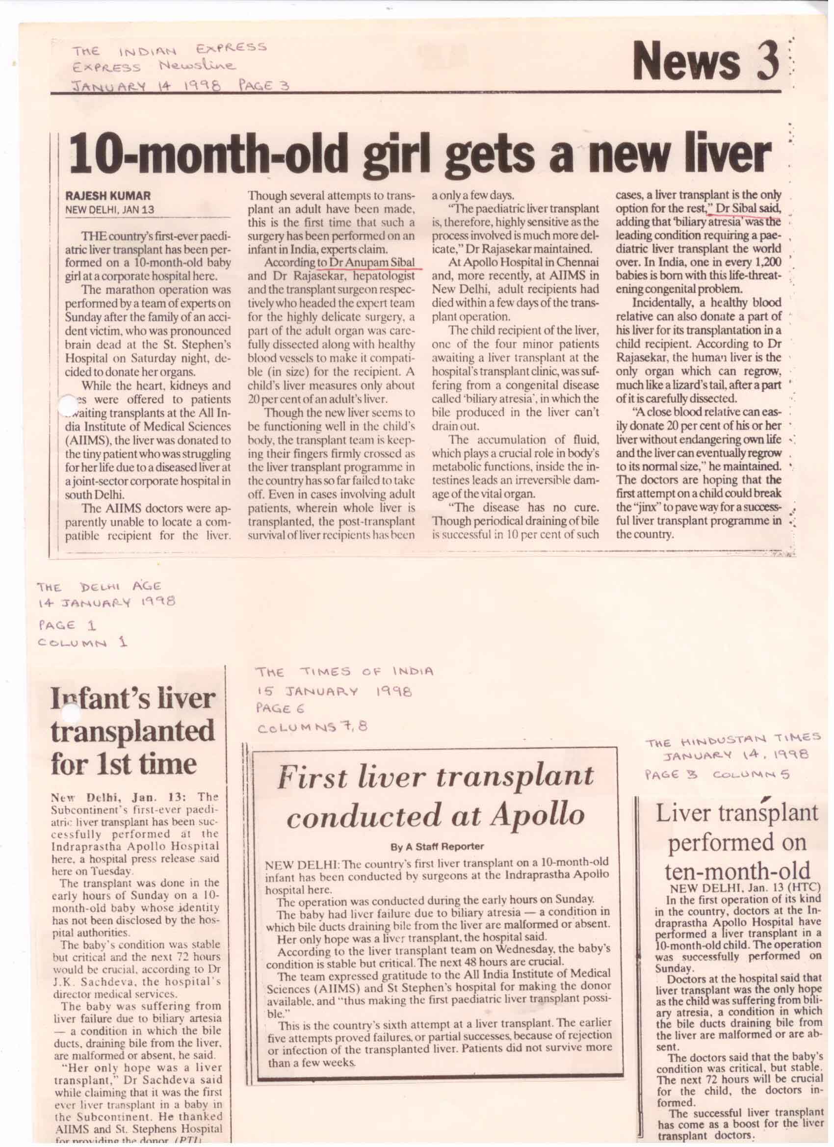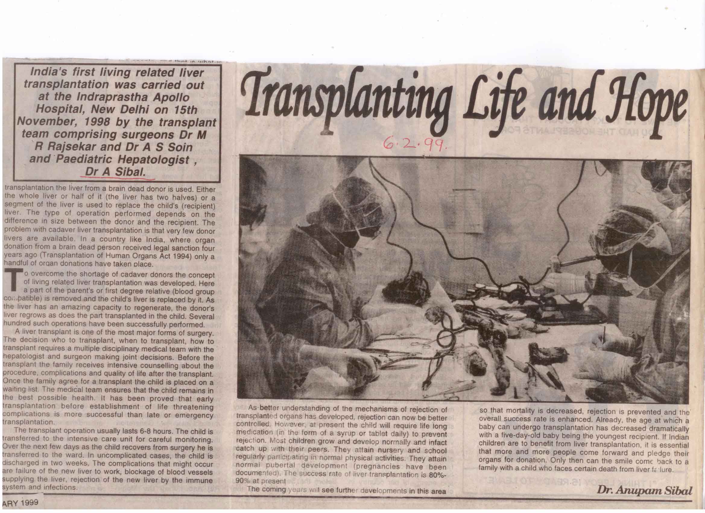 India’s first living retated liver transplatation was carried out at Indraprastha Apollo Hospital, New Delhi on 15th November, 1998 by the Transplant team comprising Surgeons