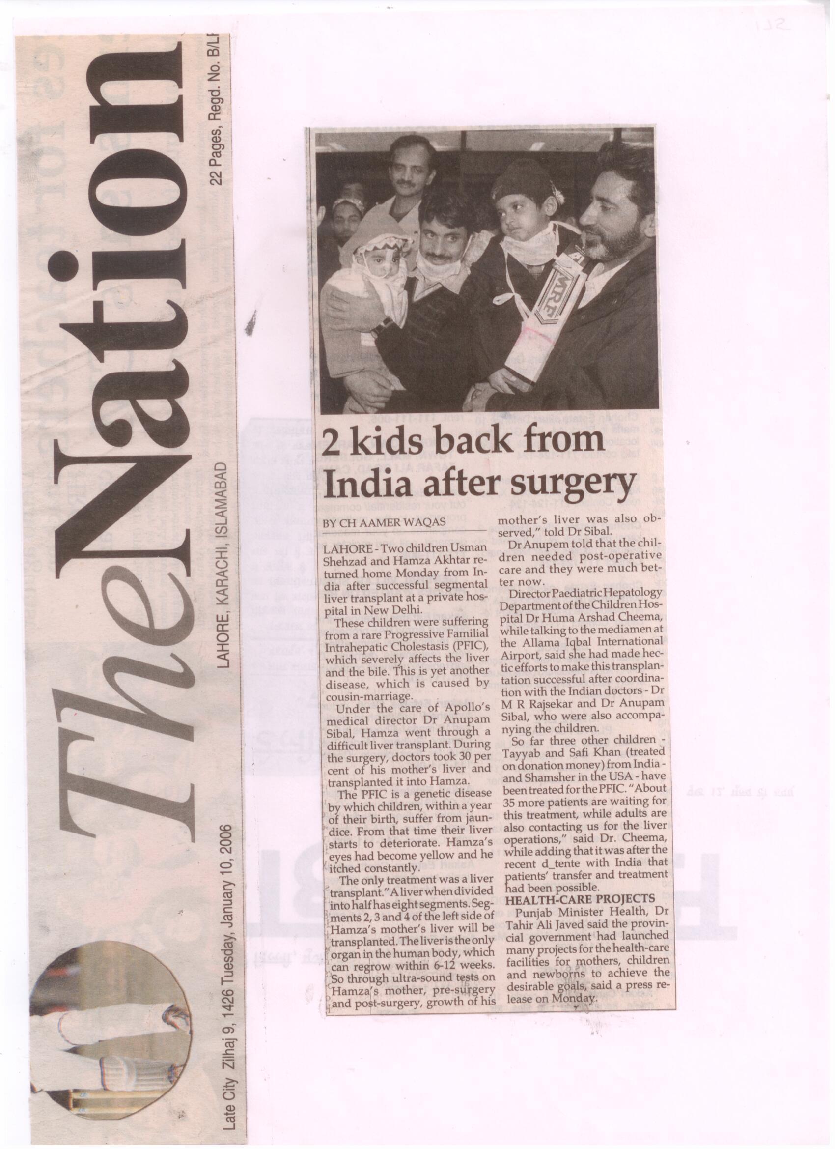 Two children Usman Shehzad and Hamza Akhtar returned home Monday form india after successful segmental liver transplant at a private hospital New Delhi