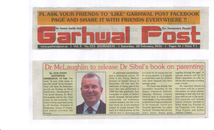 The Book “Is your Child ready to face the world” by Dr Anupam Sibal will have its Dehradun Lunch on Sunday at hotel Madhuban.