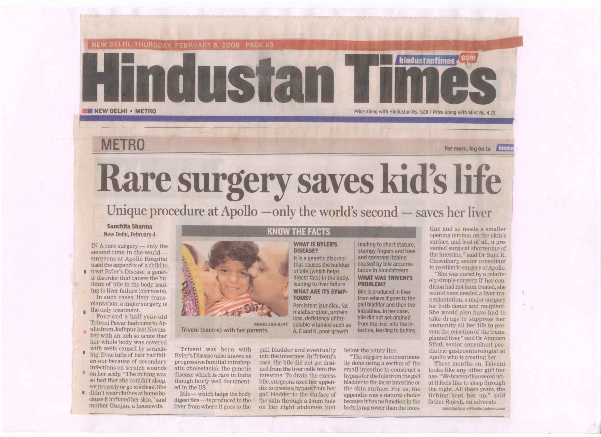 In a rare surgery – only the second time in the world surgeons at Apollo Hospital used to appendix of child to treat Byler’s Disease,