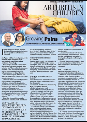 In today’s guest column, reputed Pedi­at­ric Rheum­at­o­lo­gist, Dr Sujata Sawhney addresses Arth­ritis in Chil­dren. My 7-year-old has been dia­gnosed with arth­ritis. I am strug­gling to get cred­ible inform­a­tion about this con­di­tion. Please help.